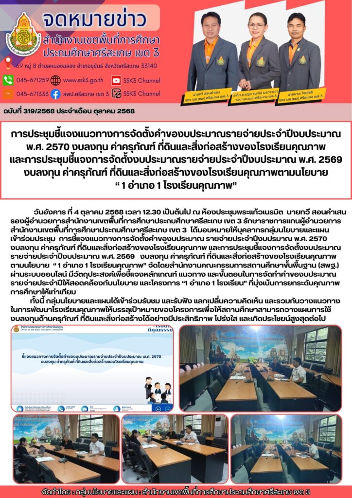 การประชุมชี้เเจงแนวทางการจัดตั้งคำของบประมาณรายจ่ายประจำปีงบประมาณ พ.ศ. 2570 งบลงทุน ค่าครุภัณฑ์ ที่ดินและสิ่งก่อสร้าง ของโรงเรียนคุณภาพ และการประชุมชี้แจงการจัดตั้งงบประมาณรายจ่ายประจำปีงบประมาณ พ.ศ. 2569 งบลงทุน ค่าครุภัณฑ์ ที่ดินและสิ่งก่อสร้างของโรงเรียนคุณภาพตามนโยบาย “ 1 อำเภอ 1 โรงเรียนคุณภาพ”
