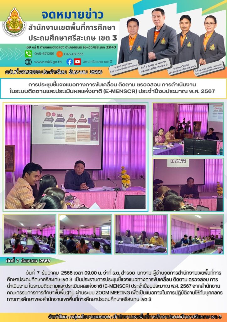วันที่ 7 ธันวาคม 2566 เวลา 09.00 น. ว่าที่ ร.ต. สำรวย นกงาม ผู้อำนวยการสำนักงานเขตพื้นที่การศึกษาประถมศึกษาศรีสะเกษ เขต 3 เป็นประธานการประชุมชี้แจงแนวทางการขับเคลื่อน ติดตาม ตรวจสอบ การดำเนินงาน ในระบบติดตามและประเมินผลแห่งชาติ (E-MEnScR) ประจำปีงบประมาณ พ.ศ. 2567 จากสำนักงานคณะกรรมการการศึกษาขั้นพื้นฐาน ผ่านระบบ Zoom meeting เพื่อเป็นแนวทางในการปฏิบัติงานให้กับบุคคลกรทางการศึกษาของสำนักงานเขตพื้นที่การศึกษาประถมศึกษาศรีสะเกษ เขต 3