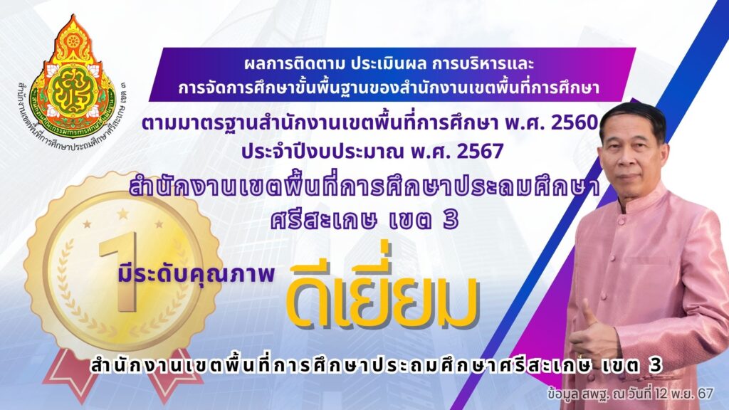 ผลการติดตาม ประเมินผล การบริหารและการจัดการศึกษาขั้นพื้นฐานของสำนักงานเขตพื้นที่การศึกษา ตามมาตรฐานสำนักงานเขตพื้นที่การศึกษา พ.ศ. 2560 ประจำปีงบประมาณ พ.ศ. 2567สำนักงานเขตพื้นที่การศึกษาประถมศึกษาศรีสะเกษ เขต 3 ได้รับการจัดระดับคุณภาพ “ดีเยี่ยม” ธันวาคม 2, 2024 Last updated : ธันวาคม 2, 2024 atthaphon phancharoen
